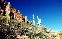 Saguaro Cacti.... Smaller ruins are at the base of the cliff